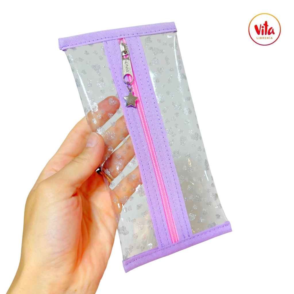 🌸 Cartuchera chata de plastico cristal con detalle en glitter.