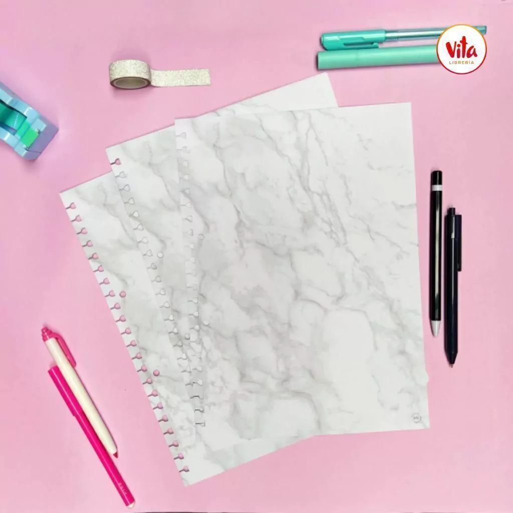 Pack x40 hojas RAYADO MARMOL de 90 gramos tamaño A4 (21x29,7 cm) de la colección Mi Punto Cero.  ¡Se pueden agregar, sacar y mover de los cuadernos!